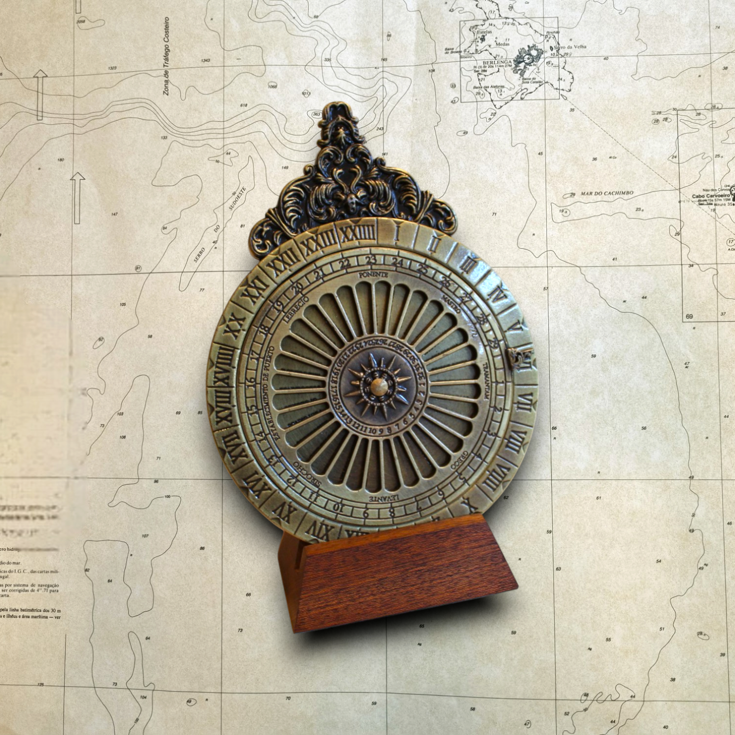 Este instrumento consiste num calendário lunar perpétuo de um lado e um ábaco ou calculadora de marés do outro.